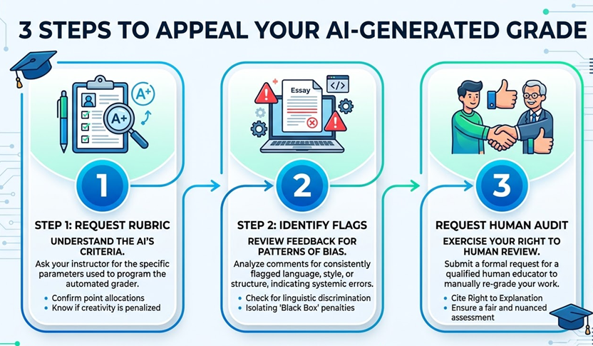 If you receive a grade that feels “off,” don’t just accept it. Most universities in 2026 have policies regarding the “Right to Human Review.” If an automated system has scored you, you are often entitled to have a human professor look at the work, especially if you can point to potential linguistic or cultural algorithmic bias in the feedback.